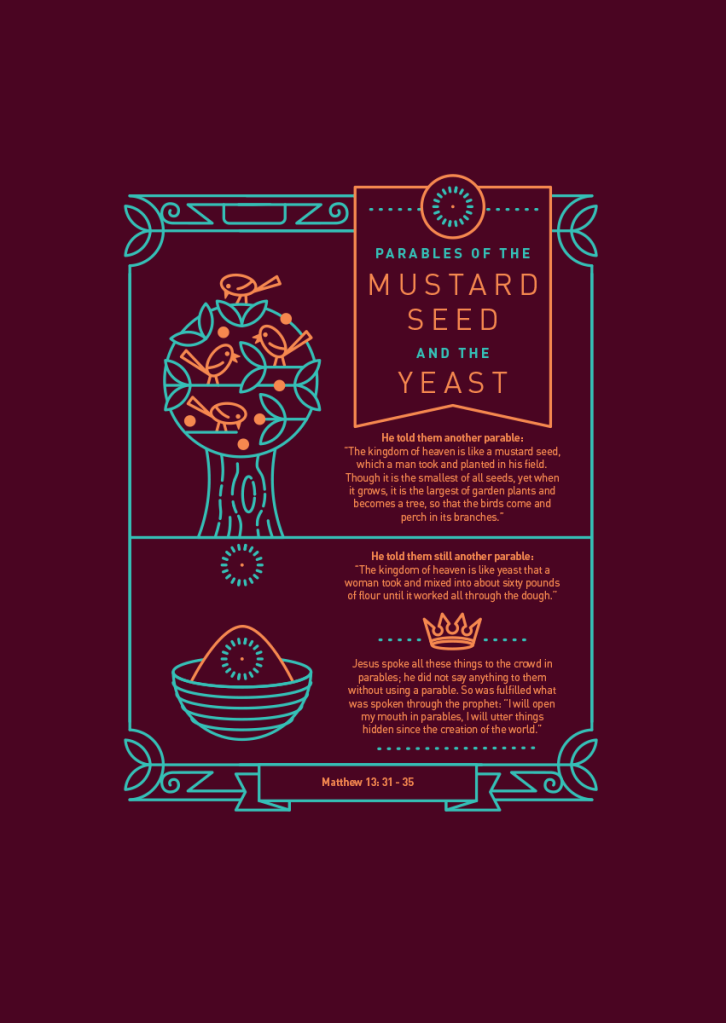 Because the Bible interprets itself, it is likely that Christ was referring to himself as the seed (James 3:18), whom God took and planted in His field, the world, for the purpose of remaking and regrowing the world. As we already know Christ was born into poverty having had the smallest of beginnings and yet today we have a world filled with believers and lovers. This parable of the mustard seed also implies that the growth is quick even supernatural in the grand scheme of things, producing a refuge, a home, a tree which not only attracts but is the giver of life. Ultimately a foreshadowing of the tree of life in the book of Revelation.