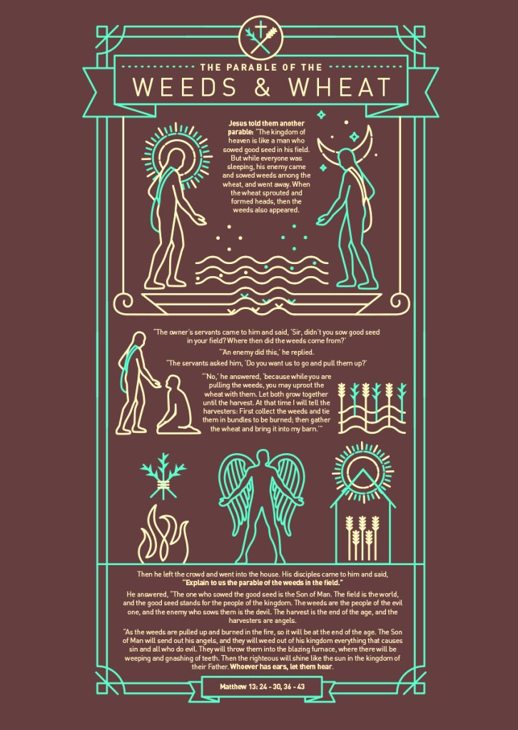 Depending on your translation, the word ‘weeds’ goes by another word; ‘tares’. Tares is a Zizania plant that looks like wheat while its growing, but once fully grown and ripe has ears which are long and grains that are black and poisonous. The parallel to good and bad people is startling, because there are those who might look good on the outside but their trajectory is a bad one. They might do and say wonderful things in this life but if it is selfish instead of selfless, their character growing black and poisonous. This should shock us, especially in light of Jesus’s statement that not everybody who calls him Lord will be saved (Matthew 7:21-23). How then are we saved? Only when we ‘know’ him, which is the only thing we can boast in – that we have a personal relationship with him. (Jeremiah 9:23-24)